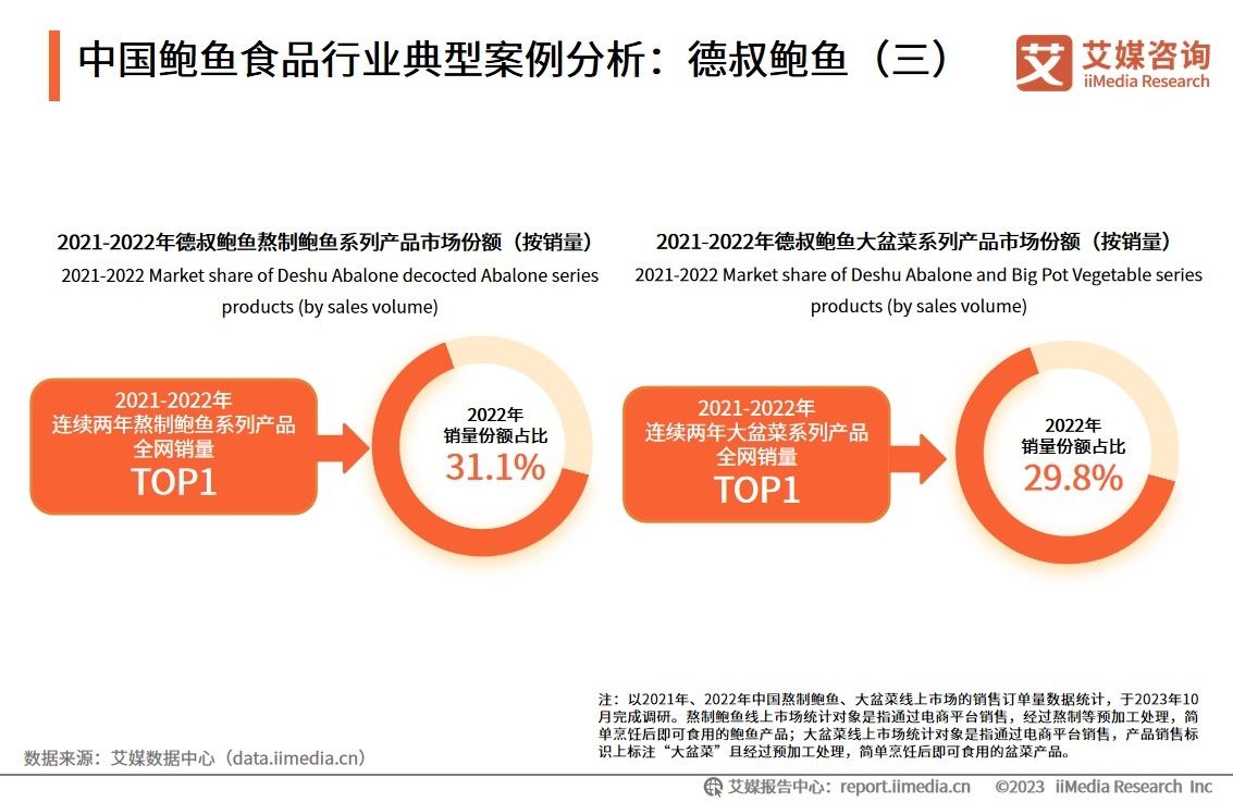 德叔鲍鱼作为行业领先品牌,也在不断探索新的销售渠道和推广模式。他们采用线下(品牌餐厅+体验专卖店)线上相结合的销售模式,通过线上营销运作带动线下销量。同时,德叔鲍鱼还积极布局抖音等电商平台,通过短视频、直播等形式展示产品特色和品牌故事,进一步推进鲍鱼品牌的产业化进程,触达更多C端用户。基于2021年、2022年中国热制鲍鱼、大盆菜线上市场的销售订单量数据统计,德叔鲍鱼“熬制鲍鱼系列”、“大盆菜系列”产品全网销量位列第一,2022年两者销量份额分别为31.1%、29.8%,荣获艾媒咨询授予的“熬制鲍鱼系列产品连续两年全网销量第一”与“大盆菜系列产品连续两年全网销量第一”双料市场地位声明认证,已然成为鲍鱼食品行业头部品牌。