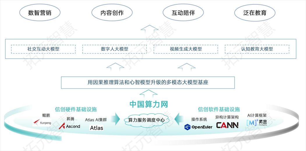 在技术架构层面,拓元团队使用了国产化的基础设施,并完成了全业务流程的测试,成功实现了大模型国产化训练和部署。以AIGC典型应用——数字人为落点,团队打造了国内首个基于国产化智算平台的数字人大模型应用平台。该平台具备形象声音、价值观行为学习能力,以及多模态互动能力,可以极大提升企业数智化运营效率和成本效益,助力企业“人工智能+”改造升级。