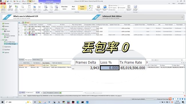 通过网络测试仪持续的数据打流,系统显示数据0丢包。