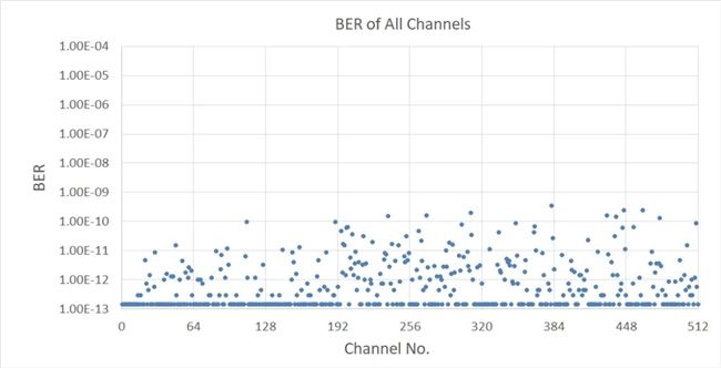 交换机所有端口插上LPO后,进行光口自环误码率测试。通过交换机命令展示可以看到所有使用的800G LPO光模块端口误码率(BER)在展会现场常温25度环境下均小于1e-11,表现十分优异。在实验室高温50度环境下也均小于1e-9,仍有5个数量级的裕量,完全满足数据中心场景使用。