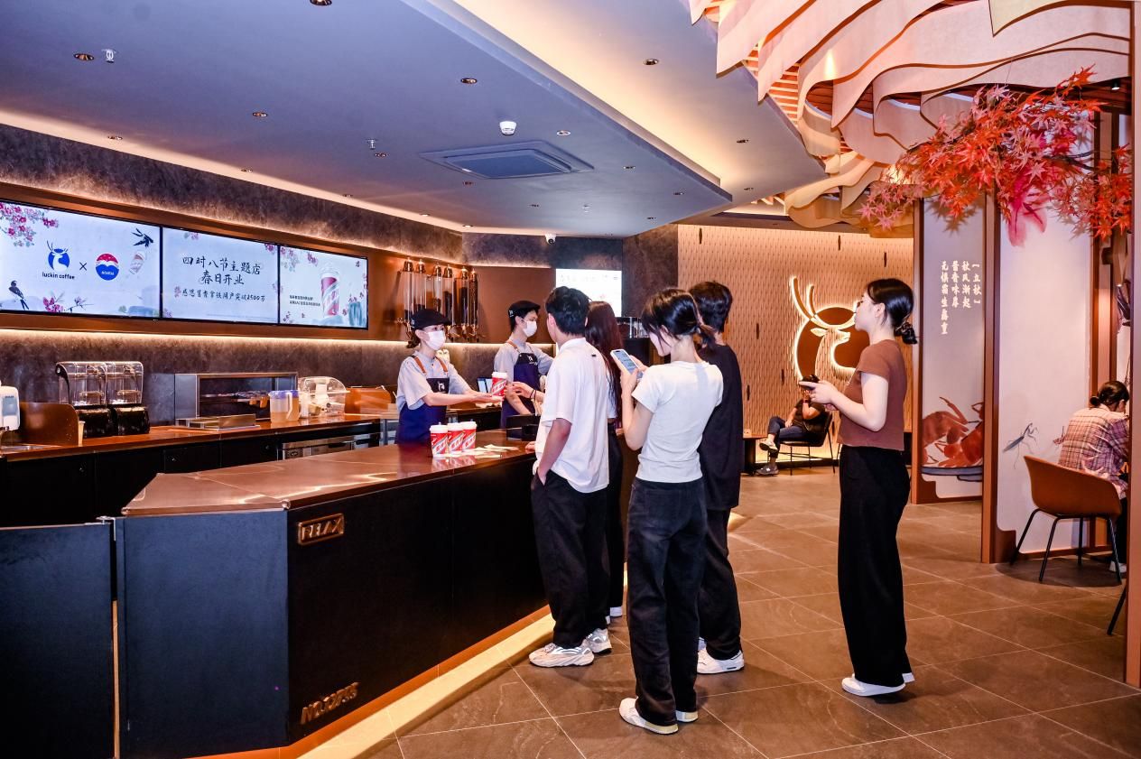 瑞幸咖啡x贵州茅台“四时八节”主题店引入著名书画家齐白石作品,以自然风物展现四时八节风景,融合东方美学与品质匠心,为消费者带来“八节习俗逐次更替,酱香拿铁四时皆宜”的咖啡体验。
