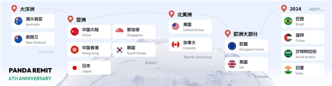 2024年,熊猫速汇即将开通南美洲巴西、中东迪拜、沙特、亚洲印度等国家/地区的汇款服务。让全球更多的用户享受到「使用便捷、价格公道」的全球汇款服务。