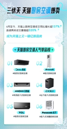 天猫618数据显示,吸顶式、立柜式、嵌入式、台下式厨房空调成为时下人气最旺的TOP 6单品。