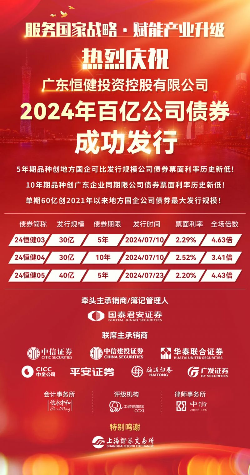 日前,广东恒健投资控股有限公司(以下简称“恒健控股公司”或“发行人”)在上海证券交易所成功发行100亿元公司债券,其中首期发行规模60亿元(24恒健03、24恒健04),创2021年以来全国地方国企公司债券最大发行规模。国泰君安证券担任牵头主承销商、簿记管理人。