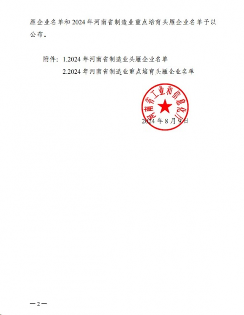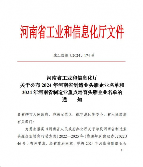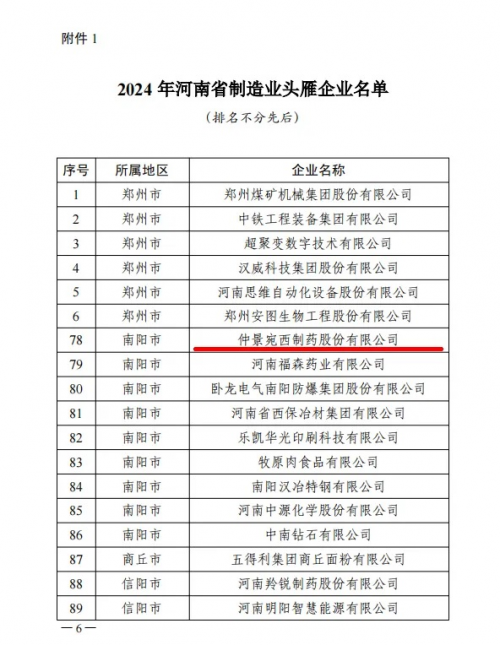 近日,河南省工业和信息化厅下发《河南省工业和信息化厅关于公布2024年河南省制造业头雁企业名单和2024年河南省制造业重点培育头雁企业名单的通知》(豫工信规[2024]174号)。仲景宛西制药再度荣获“河南省制造业头雁企业”殊荣。