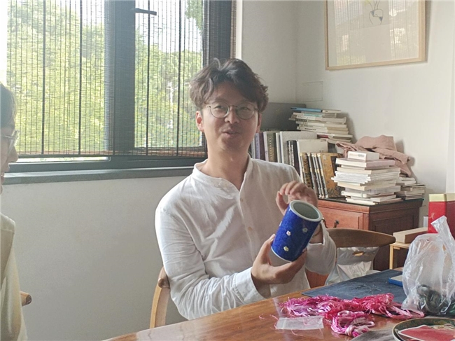 图为张雪老师为成员介绍瓷绣 7月3日 曾子涵/摄