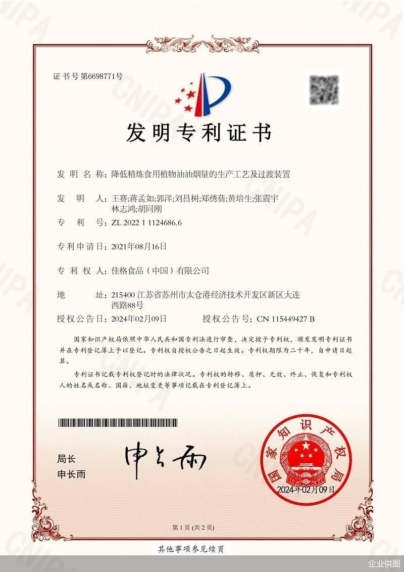 作为食用油行业的头部品牌,多力始终将更安心健康的烹饪作为重点攻坚课题。通过技术革新,从生产源头降低油烟的产生。经过反反复复的修改设计、实验验证,多力终于独创出“降低精炼食用植物油油烟量的生产工艺及过渡装置”(专利号:ZL 2022 1 1124686.6),填补了国内食用油行业相关技术空白。