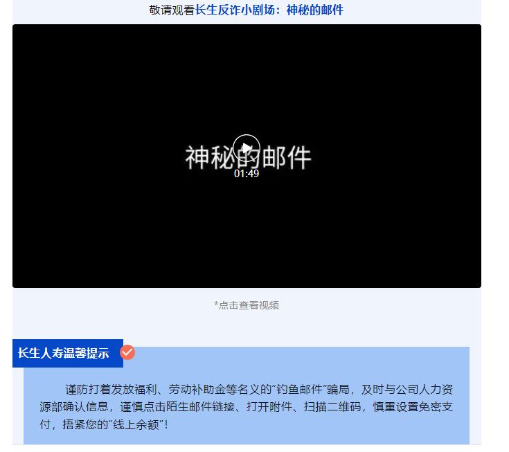 此外,长生人寿广抓线上宣传渠道,面向不同客户群体发送活动教育短信,扩展触达人群面,其中特别向老年客户发送风险提示短信,增强客户安全意识。