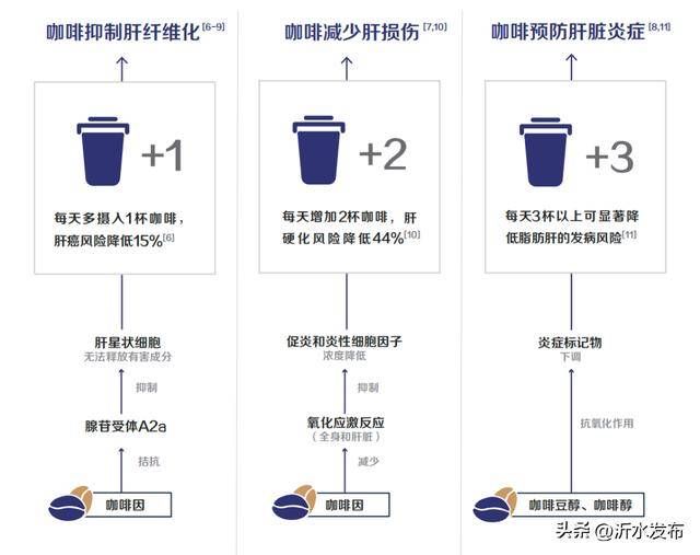 北京大学公共卫生学院教授马冠生指出,每天多喝1杯咖啡,肝癌风险降低15%;每天喝2杯以上咖啡可显著降低肝癌和肝硬化的发病风险;每天摄入量3杯以上,可降低脂肪肝发病风险。