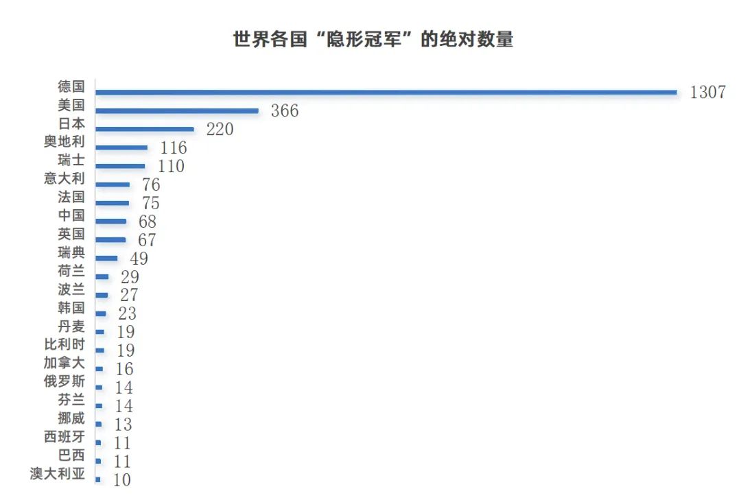 德国的“隐形冠军”以一流的业绩、高于同行的利润率和难以模仿的竞争优势在世界市场中长期占据显著地位。根据赫尔曼·西蒙收集的数据,2019年德国隐形冠军企业数量在全球排名中一骑绝尘,是第二名美国的3.6倍。