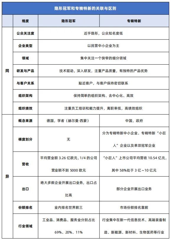 专精特新与隐形冠军都是中小企业中的佼佼者,是专注于细分市场、创新能力强、市场占有率高、掌握关键核心技术、质量效益优秀的排头兵企业。专精特新企业相对隐形冠军发展更晚一些,规模更小,但随着中国制造业在全球经济中的竞争优势显现,专精特新企业正在走向全球化,成为全球化的隐形冠军。