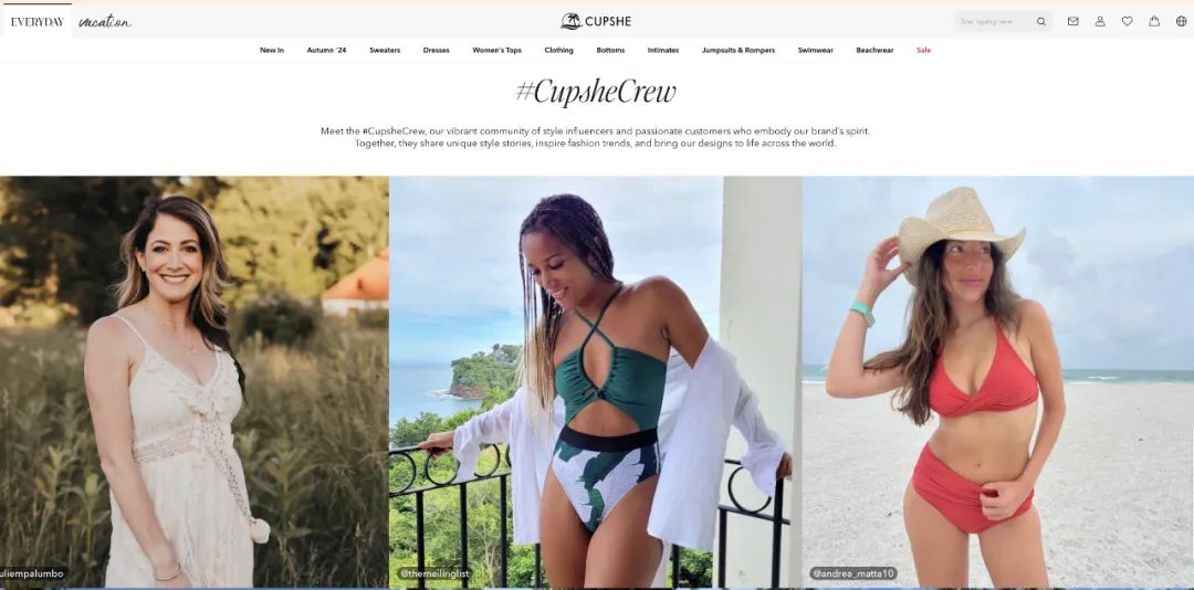第五,出色的社交媒体营销能力。北美市场泳装线上销量NO.1的Cupshe,主攻全球女士沙滩泳装市场,通过社媒营销两大王牌——KOL+UGC,用图片和视频“晒”出了上亿美元的营收。Cupshe在Facebook、YouTube、Pinterest、TikTok、Instagram、Reddit、LinkedIn上都有布局,不像其他品牌那样自己生产优质的贴文内容,Cupshe通过邀请用户、网红博主试穿后生产贴文内容(UGC内容)宣导品牌价值观。在Facebook和Instagram,Cupshe累积粉丝均超过百万,形成了品牌私域流量,为其带来了70%的独立站收入,形成了强品牌价值。