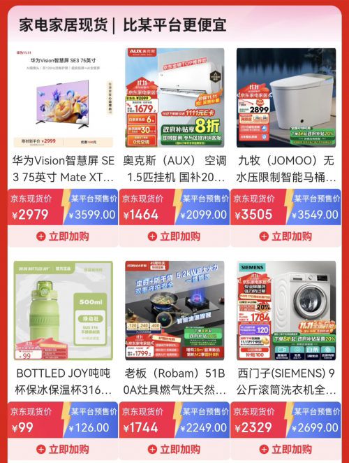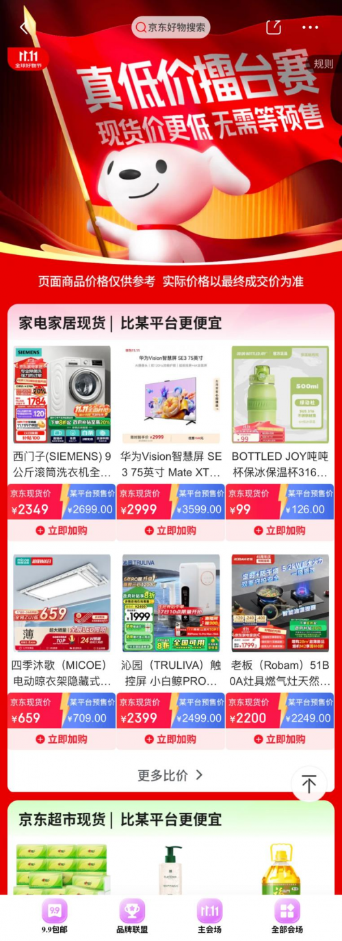 10月17日,京东上线“真低价擂台赛”活动,用户在京东APP首页搜索“真低价擂台赛”可直达活动会场。在活动会场中,洗衣机、智慧屏、净水器、智能马桶、床上用品等多款家电家居品类产品售价均低于某平台同款产品价格。相比于其他平台的预售机制,京东家电家居产品不仅价格更便宜,还是现货开售,下单即可发货。