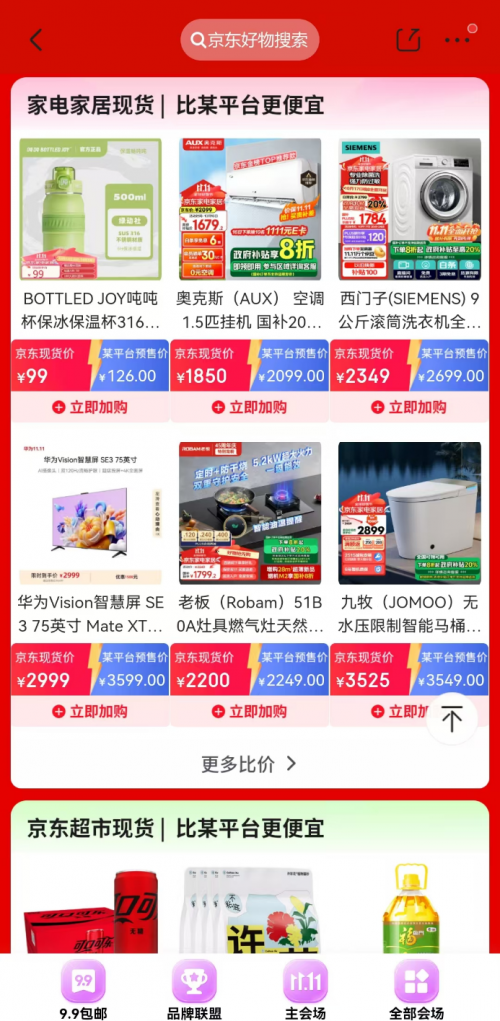 10月17日,京东上线了“真低价擂台赛”活动,其中家电家居品类商品现货价格均低于其他平台的同款商品价格。值得一提的是,有别于其他平台的预售机制,京东的产品直接现货开售,下单即可发货,无需长久等待,用户在京东APP首页搜索“真低价擂台赛”即可直达活动会场。