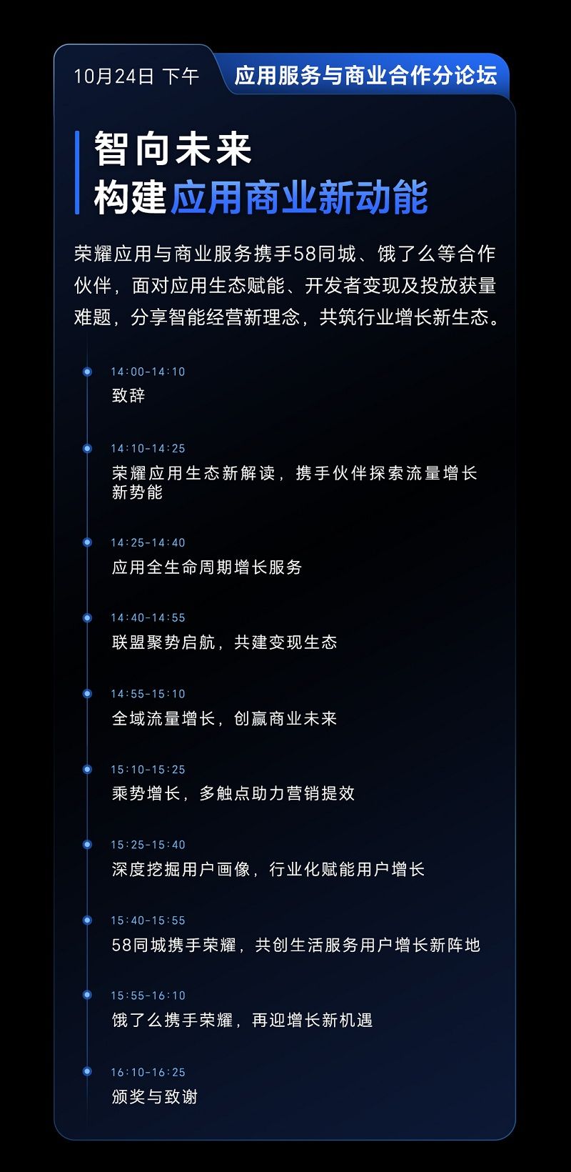 荣耀互联网服务还将邀请58同城、饿了么等头部合作伙伴进行最新的合作实践分享,为广大开发者提供用户增长及商业成功经验。10月24日,相约北京,探索流量变现新路径!更多议程详情,欢迎登陆荣耀官网,或搜索荣耀互联网服务公众号了解。