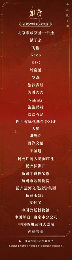 以灵犀互娱旗下主打汉文化的国风沉浸式剧情卡牌手游《如鸢》为例,游戏在全平台公测时,便迅速跻身苹果App Store免费榜第一,并正式官宣了与多达28个品牌进行联动的重磅消息。游戏联名合作范围基本涵盖了衣食住行的多个领域,比如餐饮业的巨头KFC、洽洽食品,交通出行的北京市交通一卡通、岭南通、羊城通,文化领域的西泠文创、中国剪纸博物馆等等。除了众多知名的传统行业翘楚外,还有如天猫、支付宝、美图秀秀等互联网行业的大拿,都在这次联名中与《如鸢》建立了比较深度的合作关系。