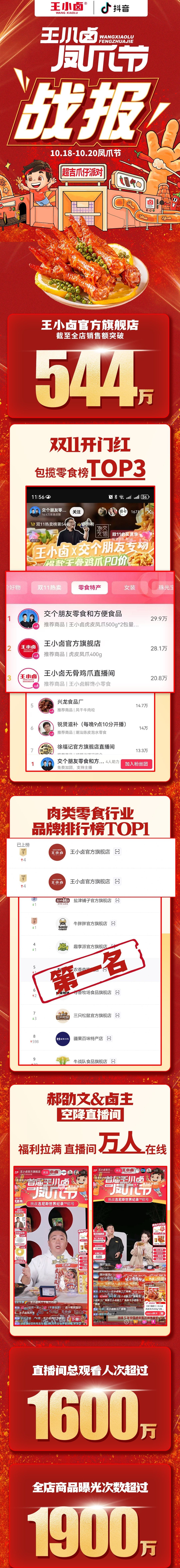 这场特别的主题直播连庆三天,销售额突破544万,成功登上抖音肉类零食行业品牌排行榜TOP1。直播中,不仅展示了王小卤凤爪节欢乐互动的精彩瞬间和令人眼花缭乱的凤爪创意美食,更让线上用户感受到了现场的热烈氛围,快乐气氛从屏幕中溢出,深度感染到了线上用户,纷纷赞叹王小卤凤爪的好吃与独特,进一步验证了王小卤凤爪产品极高的用户喜爱度和认可度。