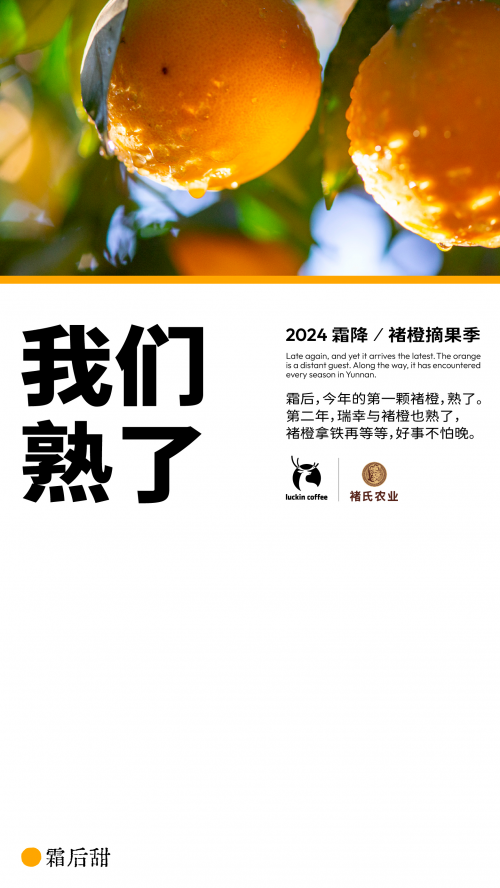 瑞幸咖啡与褚氏农业的合作,基于双方对于品质的共同追求。褚橙是高品质冰糖橙的代名词。褚橙产自北纬24度的哀牢山脉,是柑橘类水果生长的天然宝地;匠心耕耘与严格品质把关,确保了每粒褚橙的高品质。2024年1月,瑞幸咖啡与褚氏农业联合出品的重磅产品“褚橙拿铁”一经推出,便凭借橙香、芝香、咖香融合的独特风味与丰富口感层次,创造了首周695万杯的销售成绩,深受年轻消费者的喜爱与认可。
