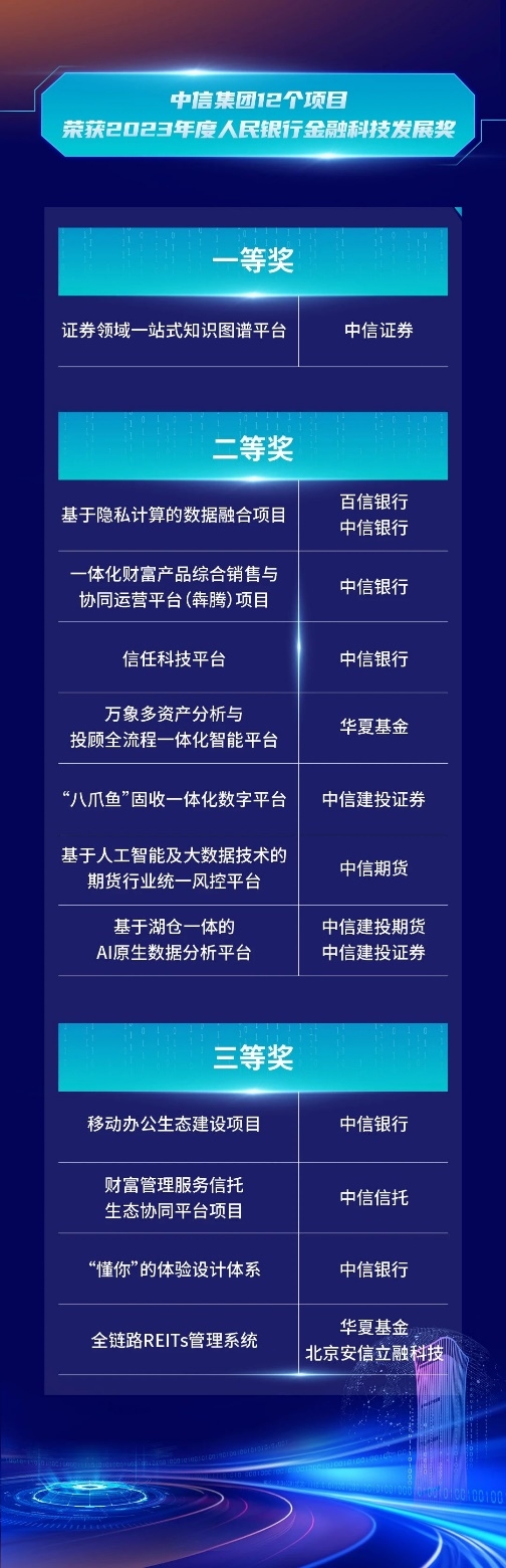 近日,人民银行公布了2023年度金融科技发展奖获奖项目名单,中信银行、中信证券、中信建投证券、中信信托、百信银行、中信期货、华夏基金、中信建投期货等单位共12个项目获奖,包括一等奖1项、二等奖7项、三等奖4项。