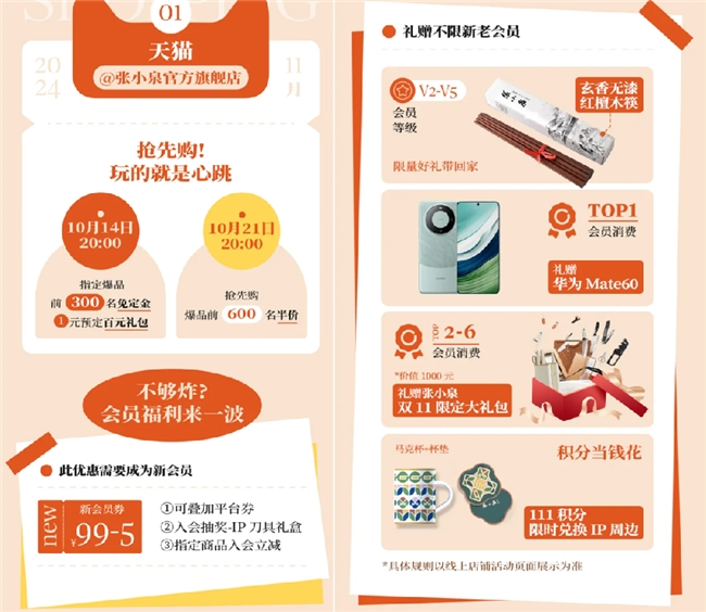 对于任何品牌而言,会员都是最为关键的品牌资产,他们是品牌忠诚度的核心体现,是品牌口碑传播的重要力量,更是推动品牌持续发展的重要驱动力。在双十一正式开启前,张小泉通过线上线下多渠道提前布局,以完善会员服务体系为依托,让会员们买的实惠、买的开心。
