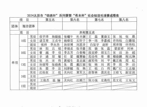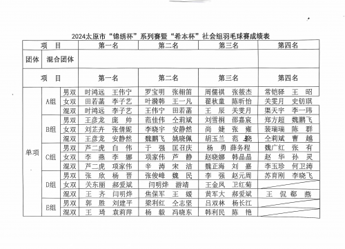 为营造浓厚的全民健身氛围,让群众真正参与比赛、享受比赛,享受健康,让更多的人参与到体育活动中来,12月1日,由太原市人民政府主办、太原市体育局承办、太原市社会体育指导中心、太原市羽毛球协会协办的2024年太原市“锦绣杯”系列赛暨“希本杯”社会组羽毛球赛在滨河体育中心完美收官。
