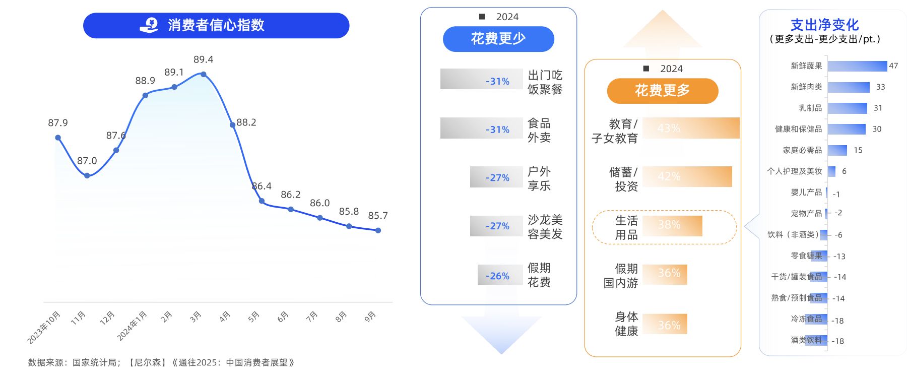 年初消费者信心指数保持在较高水平,在3月份触及峰值后呈连续下滑走势。综合来看,消费者信心指数的下降反映出当下我国消费者对未来经济发展预期的不确定性。在此背景下,消费预期谨慎将带动消费者行为转变,倾向于在家庭必需品、身心健康型产品上投入花费。预计在未来一年内,消费者将在新鲜蔬果、新鲜肉类、乳制品、健康和保健品、家庭必需品上增加支出,同时减少用于聚餐、外卖、户外、美容美发、假期消费等非必需品支出。