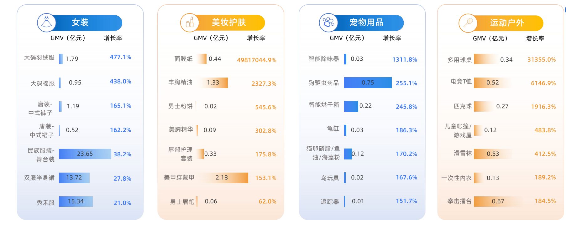 随着文化自信的提升和时尚审美的演变,传统服饰如唐装服饰、汉服半身裙迎来了蓬勃发展。男性自我形象认知的升级和消费力的释放也推动男士化妆品类实现亮眼高增长,其中以男士粉饼、男士眉笔等细分品类表现尤为突出。同时,随着户外出行的回暖,滑雪袜、一次性内衣等品类也呈现出强劲的爆发势头。此外,宠物经济在2024年热度不减,智能除味器、智能烘干箱等细分市场的增速均突破了200%。