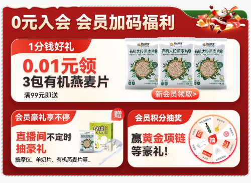 除了年货礼盒之外,今年双旦期间,盛健羊乳还为消费者带来了其它多重福利,包括直播补贴以及新人入会礼。在直播间,盛健羊乳为大家准备了专属补贴福利,主打产品最高可享受25元的优惠,同时还有按摩仪、羊奶片、有机燕麦片等好礼相送,并设置了福袋和红包雨等互动环节,惊喜多多。活动期间,盛健羊乳还为新会员入会的会员准备了惊喜,即:满99元即可获赠3包有机燕麦片的新人礼!