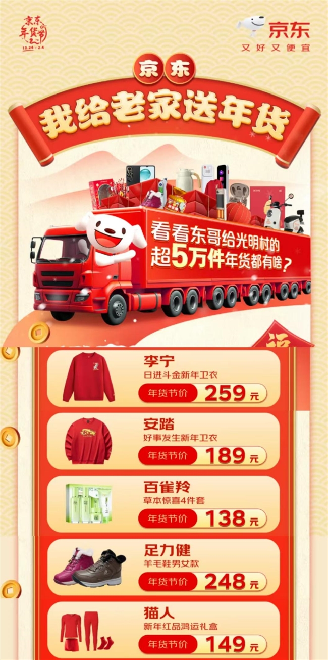 腊八到,大街小巷年味渐浓,家家户户也开始置办年货。近日,京东联合超百大品牌、名人发起全国最大规模的“我给老家送年货”活动,邀请全国各地用户为家乡、为亲朋好友送上年货好礼。活动上线之初,京东集团创始人、董事局主席刘强东就为家乡江苏宿迁来龙镇光明村的乡亲们,送上了超5万件年货,其中包括百雀羚洁水乳霜四件套、足力健老人雪地靴男女款、安踏卫衣、李宁卫衣、猫人内衣礼盒等多款服饰、美妆好物,让父老乡亲温暖过新年。即日起至2月12日,消费者打开京东APP搜索“我给老家送年货”,即可入手“东哥”已下单的同款年货。