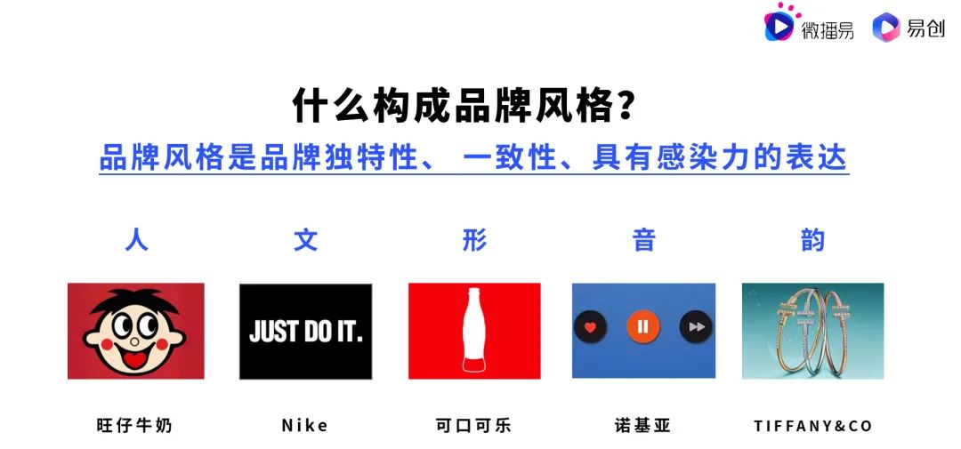 无论什么情况下,只要看到第一个图我们脑子里就出现了旺仔这个品牌,当看到 JUST DO IT 的文字就会联想到背后的品牌Nike,看到这个瓶子的剪影自然而然会想到可口可乐,还有这个开机铃声,以及标准的Tiffany蓝色都和品牌有着非常强的关联,这就是它们的风格。