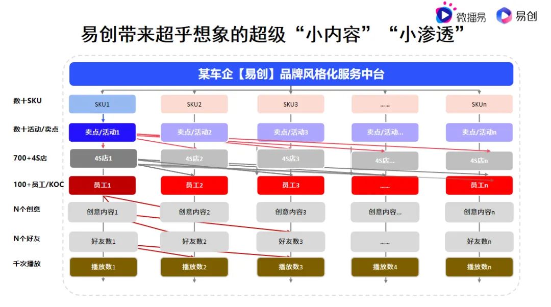 这个改变对品牌有什么影响呢?将会带来无限的、高质量的裂变。假设这个企业有2-4万个门店销售,每个销售有400个好友,如果有一半的人每天从素材库里调用对应的素材,生成视频,发到朋友圈,那么,他每天带来的曝光量可能已经大于今天投出广告的预算量了。