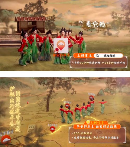 就如平安好车主这支“年货节奇妙游”,在延续“唐宫夜宴”国风舞蹈特色的同时,又复刻了马车出行的古代“春运”故事,以及采买年货、赏灯、收红包等传统年俗。