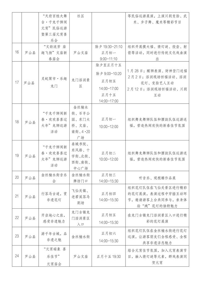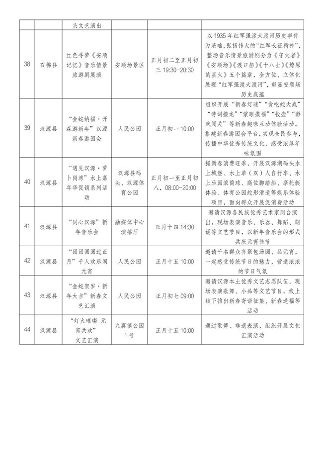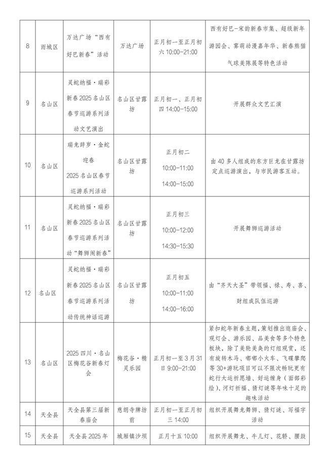 记者从雅安市文化广播电视体育和旅游局了解到,蛇年春节,雅安重点推出44项特色文体旅系列活动,包括《熊猫归来》大型史诗剧、灵蛇纳福·瑞彩新春2025名山区春节巡游系列活动等(详见后表)。