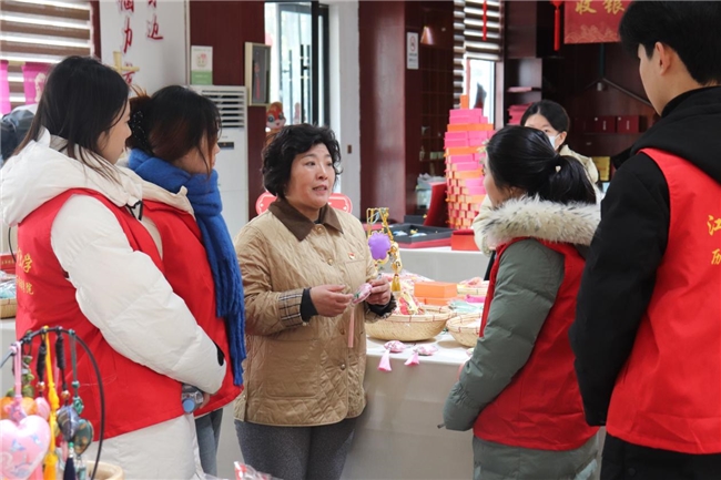 马庄村村委会主任、党委副书记王霞向我们介绍了潘安湖的改造和马庄村的发展。王霞主任说道:“从前的马庄村及贾汪区曾以煤矿产业为主,环境恶劣,人民的生活艰苦,生活质量较低。‘白衬衫上午去黑衬衫下午回’是当时的普遍现象,反映了当时贾汪区的环境污染严重。后经过区政府的积极引导,煤矿塌陷地得以改造,潘安湖国家湿地公园逐渐建立,环境质量也随之改善。”同时以孟庆喜书记为代表的村支书们稳步推进马庄村的各项工作,坚持文化立村、文化兴村,结合文化与农业,流转 3000 多亩村民土地发展农副产品,提高农民收入附加值,马庄的香包便成为了特色的支柱产业。王霞主任还向我们展示香包的制作和特点,让我们更加深入地了解了马庄香包的魅力和马庄村发展的力量。
