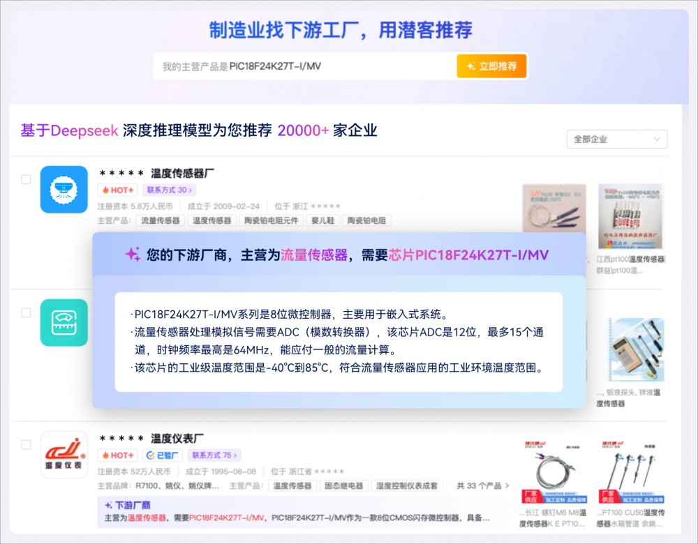 该图谱整合了20亿商品数据和40万亿+产品关系对,能够智能识别产业链上下游关系及企业间的供需关系,进而挖掘潜在商机。在传统销售模式下,企业主往往受限于对行业上下游关系的认知不足,依赖人工筛选客户,效率低下且难以突破现有客户群体。通过探迹SalesGBN ,企业主只需输入主营业务关键词,即可获取潜在客户推荐,每个推荐都会附带有推荐理由,比如某下游厂商的某产品需要用到此生产原料等等,通过精细至产品原料/型号级别的产业链数据,实现目标客户的精准推荐。探迹SalesGBN接入DeepSeek-R1大模型以后,结合其擅长的长链推理能力,推荐理由更加详尽细致,帮助企业快速拓展新客户群,打破传统拓客的认知壁垒。