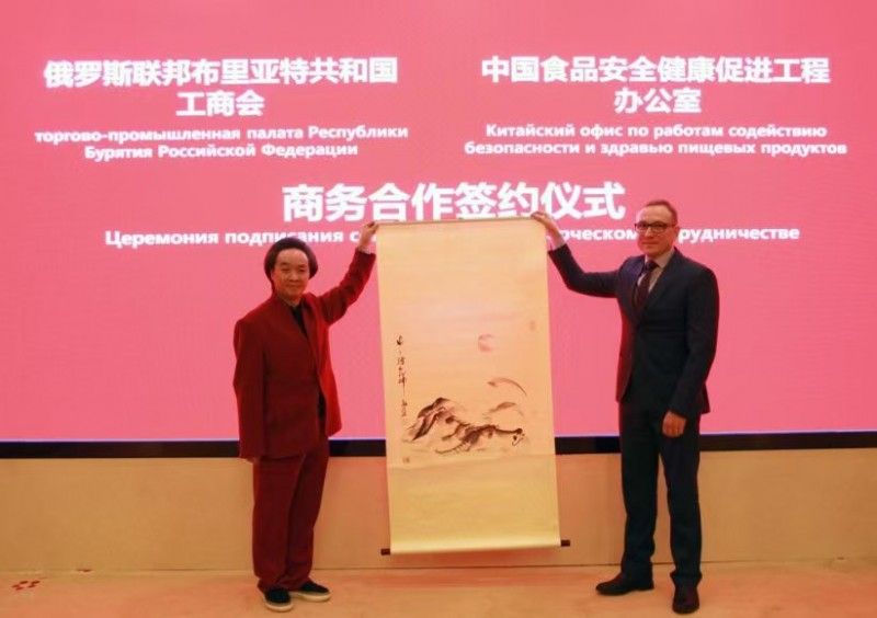 活动现场,中国食品安全健康促进工程办公室特别向俄罗斯联邦布里亚特共和国工商会赠送了中国传统书画作品,展现了中华文化的深厚底蕴,传递了“互利共赢、文化互鉴”的合作理念。