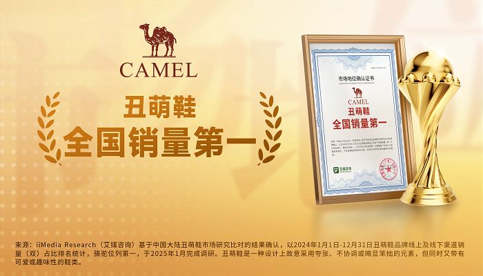 2025年2月,骆驼获全球新经济产业第三方数据挖掘和分析机构iiMedia Research(艾媒咨询)授予的“丑萌鞋全国销量第一”市场地位确认。