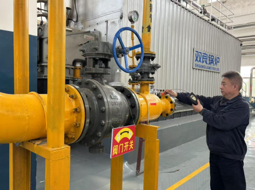 (图为动力车间司炉操作工对燃气管道进行检查)