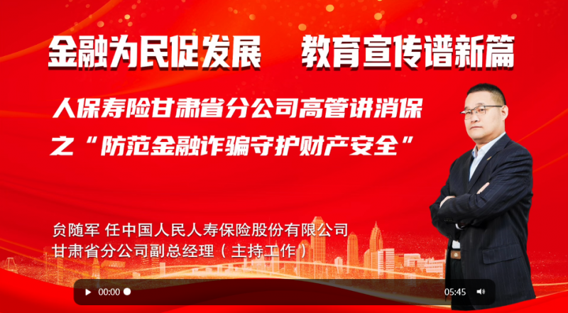 2月21日,人保寿险甘肃省分公司主要负责人参与线上教育宣传组宣传活动,录制了《人保寿险甘肃省分公司高管讲消保之“防范金融诈骗守护财产安全”》的专题宣传视频,通过生动形象的讲解,增强了消费者的金融安全意识。