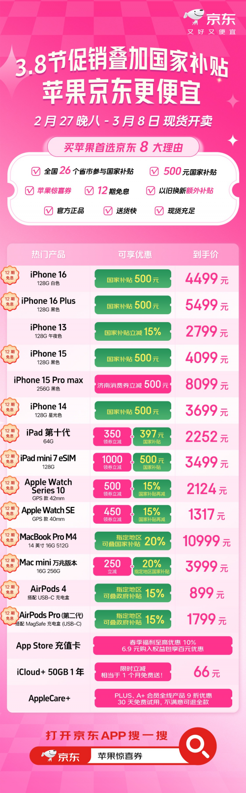 京东3.8节全面开启!在此次活动中,备受瞩目的iPhone16系列手机成为焦点,国家补贴、惊喜券、白条免息及以旧换新享额外补贴等权益,为消费者带来了前所未有的超值体验。据悉,北京、安徽、上海、江苏、湖北、浙江、海南、广东、河南、山东等26个省市的消费者均可在京东领取500元国家补贴。除了iPhone,iPad、MacBook Pro、Apple Watch等产品也均可参与3.8节活动。无论是追求极致性能的商务人士,还是热爱潮流科技的年轻人,都能在这次活动中找到满足自己需求的产品。