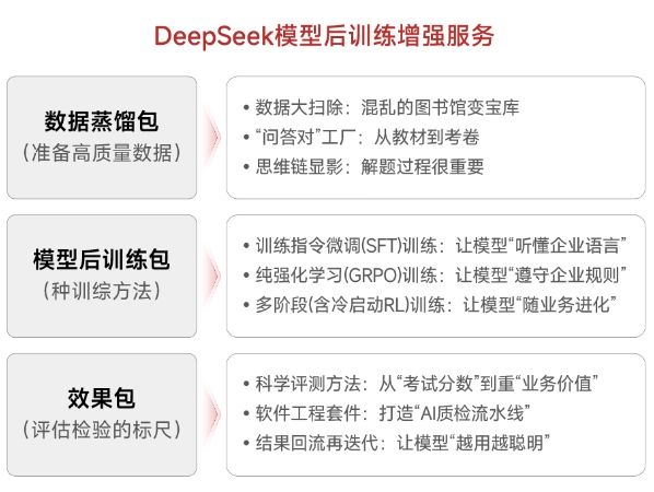 • 指令微调训练/纯强化学习/多阶段混合式训练方法,让模型更懂企业。