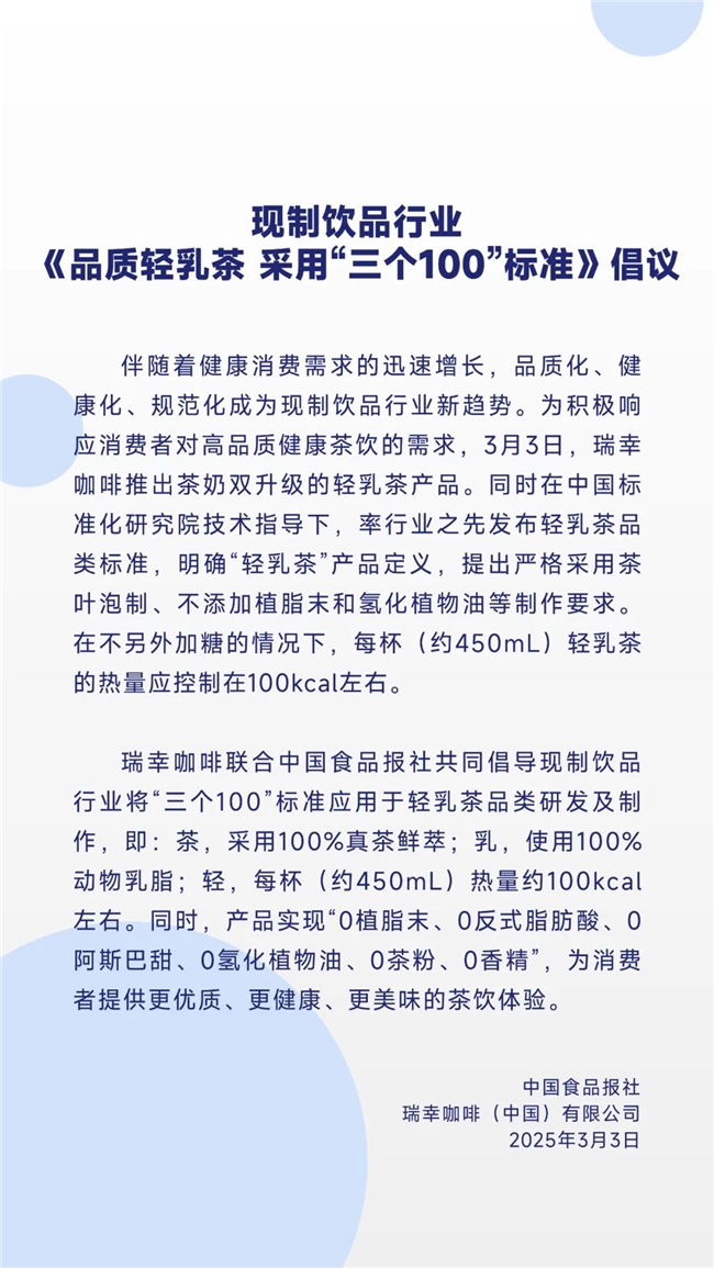 瑞幸发布“三个100”轻乳茶标准倡议,健康化正驱动品质升级!