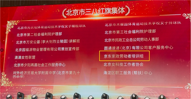 北京市妇联每年组织“三八红旗”集体及个人评选,旨在发掘各领域兼具时代精神与卓越品质的女性典范,通过榜样力量激励妇女投身社会主义现代化建设。此次荣获“三八红旗集体”称号的京东家政劳动者培训组,于2021年组建,培训面已覆盖超10万人次。培训组52名优秀实操讲师遍布全国14个城市,以孜孜不倦的教导授课,帮助更多女性劳动者掌握和提升服务技能,用勤劳的双手创造更好的生活。