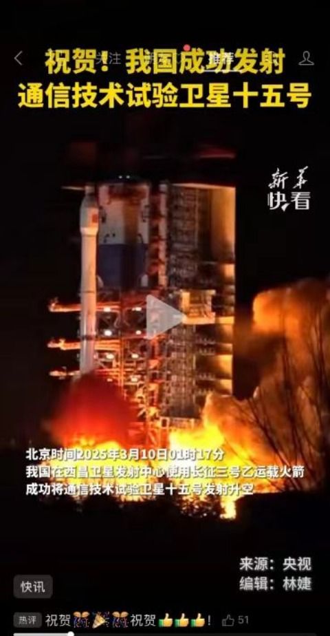 2025年3月10日01时17分,西昌卫星发射中心,长征三号乙运载火箭将通信技术试验卫星十五号送入太空。