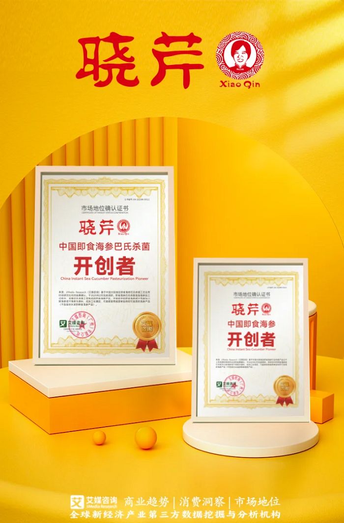 2025年2月,晓芹获全球新经济产业第三方数据挖掘和分析机构iiMedia Research(艾媒咨询)授予的“即食海参巴氏杀菌开创者”“中国即食海参开创者”两项市场地位确认。