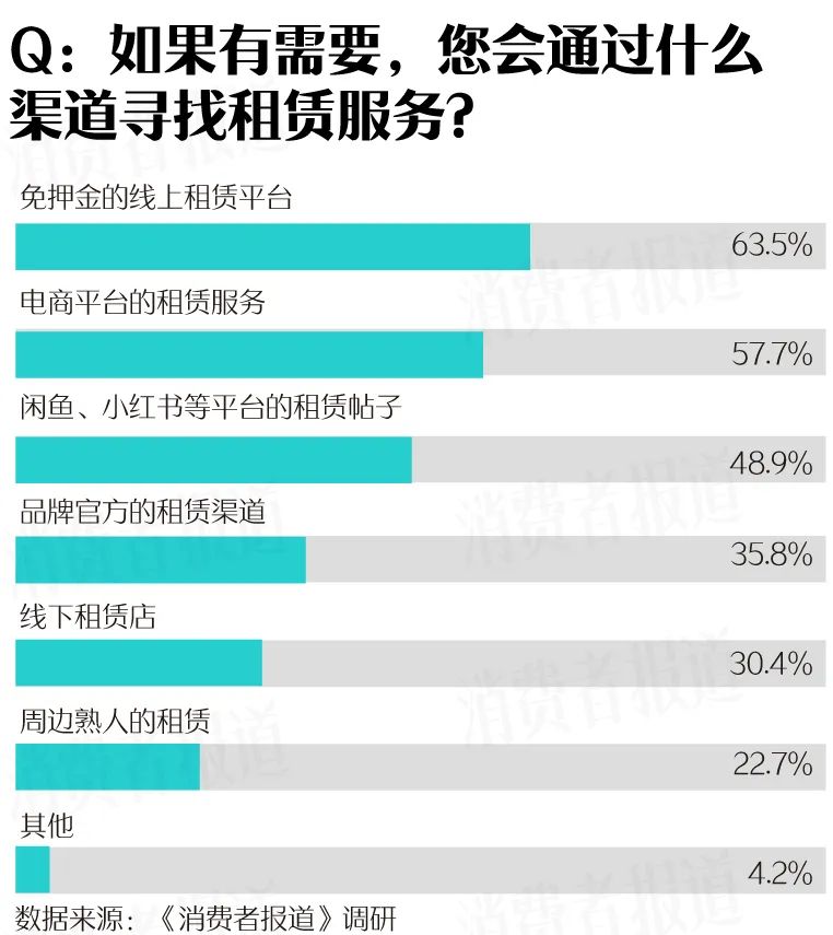《消费者报道》问卷调研数据显示,受访者倾向于在免押金的线上租赁平台寻找租赁服务。对比起传统租赁模式,B2C租赁平台用“信用”取代“押金”,降低了年轻消费群体的准入门槛,搭建了更加透明、高效的服务流转体系。