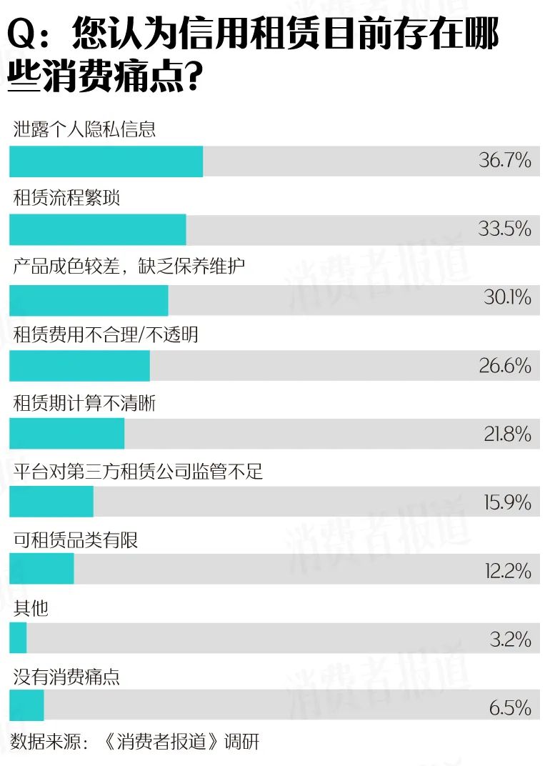 根据《消费者报道》的调研数据,信用租赁的消费痛点主要集中在隐私安全、租赁流程、产品成色、租赁费用计算等环节上。超过三成受访者认为租赁商品成色差,缺乏保养维护、租赁流程繁琐、泄露个人隐私信息。
