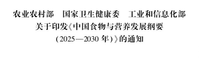为统筹食物与营养协调发展,支撑健康中国建设,农业农村部、国家卫生健康委、工业和信息化部制定了《中国食物与营养发展纲要 (2025—2030年)》并于近日发布,为产业创新发展和国民日常饮食提供了指导和参考。