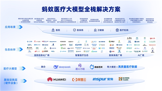 为解决这一问题,蚂蚁集团联合阿里云、华为医疗卫生军团、卫宁健康、纳里智数等近百家产业伙伴,宣布推出全新“蚂蚁医疗大模型一体机”全栈解决方案:医疗机构仅需一键接入蚂蚁医疗大模型一体机设备,即可完成国产算力、医疗大模型、AI训推一体的私有化部署,推进院内业务系统、患者服务AI升级。据悉,杭州市医保局、宁波市鄞州区卫健委、北京中医医院、上海仁济医院、上海市中医医院、浙江省人民医院、迪安诊断共7家机构成为首批接入合作的医疗机构。