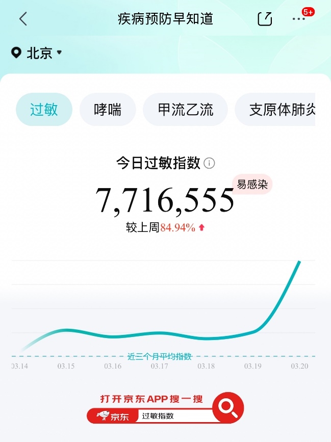 该产品以京东平台内用户搜索、咨询问诊、购药等行为综合计算得出的指数。京东健康“过敏指数”显示,3月19日以来,北京当地的过敏指数急速上升,3月20日已经升高至近期3倍水平。3月20日过敏指数日环比增长122%,周环比增长84%,北京处于易感染状态。